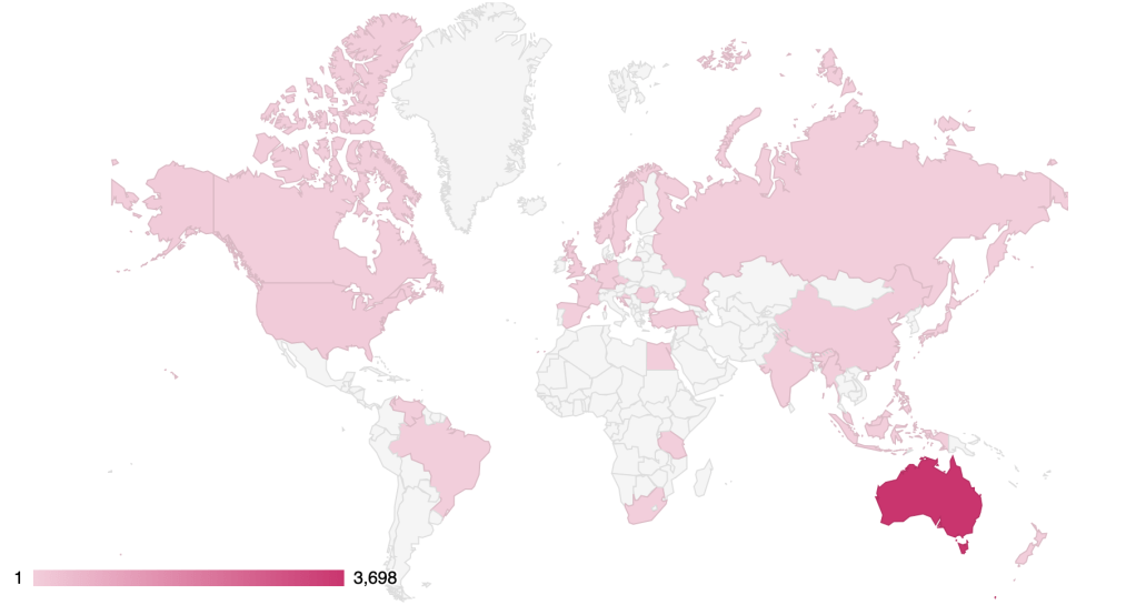 To make 100 runs in a cricket innings is considered a significant mark of technique, application and stamina. This is the 100th post on PenPaintandscalpel, and I suspect these afore mentioned qualities apply as much to the readers of the blog, as they do to the author. 100 posts was a goal that I set when beginning this project, acutely aware that most blogs don’t last for more than a few dozen posts before enthusiasm and ideas fade. I have immensely enjoyed this experience as a new way to communicate with my readers/friends, in a manner that reflects my personal style. WordPress gives me a lot of information about my blog. Readership events are approaching 4000, most people access the site from Facebook, and my most popular post was about a pasta meal from my childhood. As you can see from the heat map, the site is visited from all over world, representing where people live or travel, along with the global interest any internet activity attracts. Having reached 100, it is my intention to continue forward and to continue to have fun. To my readers/friends, congratulations and thanks for getting us this far. Watch out for more posts on PenPaintandScalpel. #loveyouall #letsmakelemonade