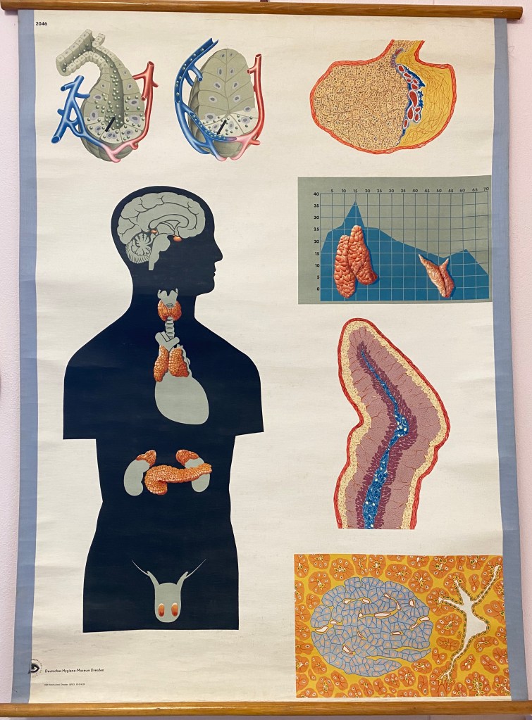 If you visit my office at TQEH Department of Surgery, you will encounter one of my favourite pieces of art. This is an original teaching poster from the German Hygiene Museum. The images of the human endocrine organs are unadorned, powerful and verge on abstraction. It is a really cool educational tool. The German Hygiene Museum was founded in 1912 as a public venue for health education. For a time during the Third Reich it came under darker influences, providing propaganda relating to racial ideology and eugenics. This poster dates from the 1950s, when the museum was an influential East German institution. How it came to be in an Adelaide antique shop is hard to imagine. #endocrinesurgeon #letsmakelemonade