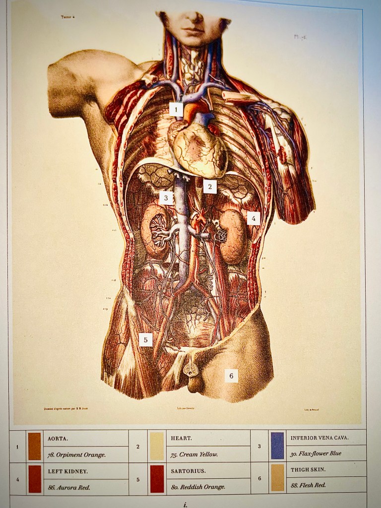 It is the nature of what I do, that I have spent many hours over anatomy texts. They nearly all have diagrams and remarkably they are all the same colours. Why? Werner’s Nomenclature of Colours by Patrick Syme was published in 1814. It is a small book, with 108 colour swatches. It represents a highly successful attempt to classify all the colours of the natural world. All the colours are numbered, have specific blending recipes and specific examples of natural objects that match. It includes links to the kingdoms of animal, mineral and vegetable. In 1831 Marc Jean Bourgery took it up a notch. In Traite complet de L’anatomie de thomme, he produced an anatomy text that included referenced colours from Werner’s Nomenclature. The colours of anatomy texts going forward were set in stone. More significantly, man was reocgnised as just another part of nature. My favourite is the IVC, #30, flax flower blue. #dontcutthebluewire #letsmakelemonade