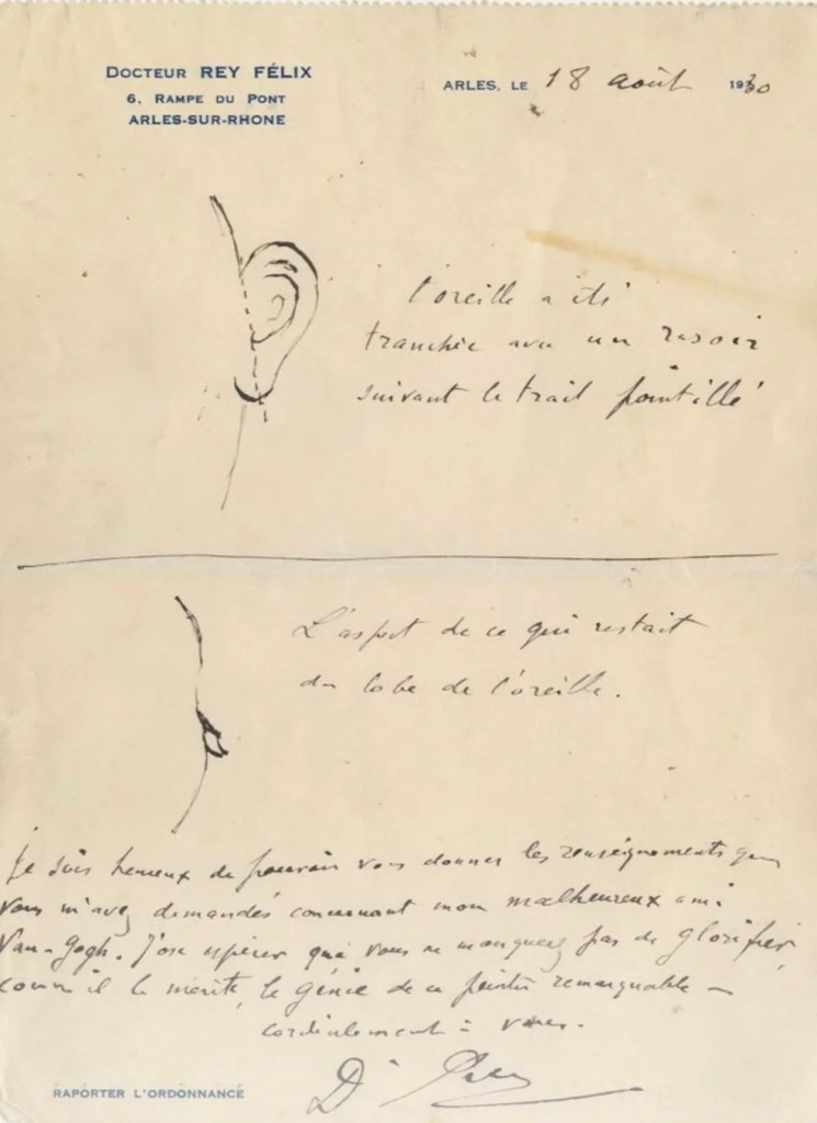 Health professionals are familiar with the phrase if you didn’t write it down it didn’t happen. We all know the story of Van Gogh self mutilating his left ear with a razor. The self portrait with bandaged head produced shortly after the 1888 incident has a become an iconic image of the artist. The controversial aspect of the event is the amount of ear actually removed by the depressed and agitated Van Gogh. After the episode of self harm, Vincent was treated by French doctor and friend Felix Rey. Rey tried subsequently to deal with speculation by producing a sketch of the injury suffered by the artist. It is important, but not as definitive as you might hope. The sketch was drawn from memory in 1930. Medicolegal experts would be quick to point out that retrspective notes carry very little weight. #atimebeforeepas #letsmakelemonade