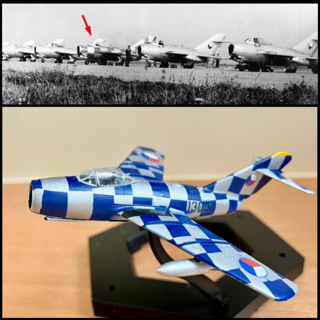 So I also paint model aircraft. This has become a booming hobby post pandemic. Most of them are basic silver, but this blue paint design caught my eye and I had to give it a try. It is a1954 MIG-15, the 1303. It was deployed for anti-aircraft artillery training by the Czech military. The chequer board pattern is designed to increase visibility rather than camouflage. Sadly this plane also has a chequered history. In February 1964 this MIG was involved in a three plane mid air collision over Sezemice. Captain Jurecka in the 1303 ejected to safety, but the other pilots were not as lucky. #checkouttheblue #letsmakelemonade