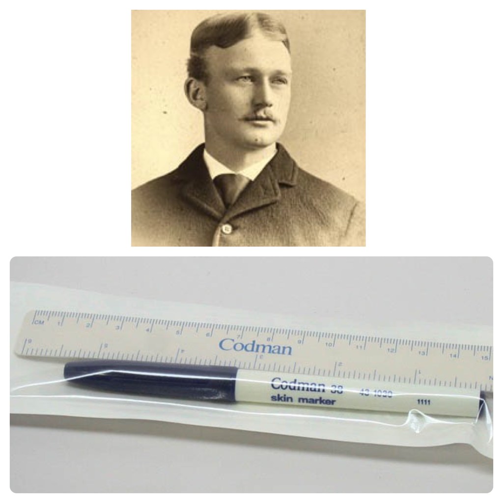 If you have ever stood at an operating table you will recognise the above image. It is a Codman skin marker, disposable, indelible, sterile and complete with a little ruler. It is in the room for nearly every operation in nearly every surgical specialty. Breast Endocrine Surgeons use them religiously. We couldn’t make an incision without them. Draw six incision lines and cut on the seventh is our motto. The Codman pen is named after Ernest Codman, Orthopaedic surgeon at MGH (Massachusetts General Hospital of anaesthetic fame) 1902-1914. Codman was a crusader of documenting the so called end results of operations. Codman kept little cards with details of all procedures performed at MGH. He was the father of peri-operative mortality. His system of cards was so popular that was forced to leave the MGH and start his own small hospital. Eventually all was forgiven. #ifeelhispain #letsmakelmonade