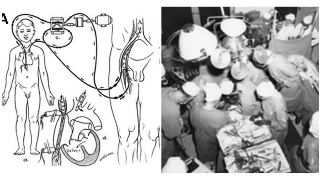 The first open heart surgeries were the closure of small atrial septal defects. Chill the patient to protect the brain, clamp the vessels to and from the heart, cut open the atrial wall and suture like someone else’s life depends upon it. It was reasonably successful, most survived if the atrium was open for less than 5 minutes. Large ASDs, ventricular septal defects and Tetralogy of Fallot’s were a more significant challenge. Complex suturing, patches and valvular reconstructions were needed, 5 minutes were not enough. Experiments with early heart bypass machines and dog circulations were disastrous . Finally on April 20 1954, Walton Lillehei from the University of Minnesota took a new approach, one with a huge gamble and a potential mortality of 200%. A 3 year old boy had a VSD repair whilst his circulation has supported by direct cannulation to his father, All went well, the child lived to be 67. Over the next year 45 similar surgeries were performed, with 20 of the children living to at least 50. No parents were harmed in the process. #beforebypassmachines #letsmakelemonade