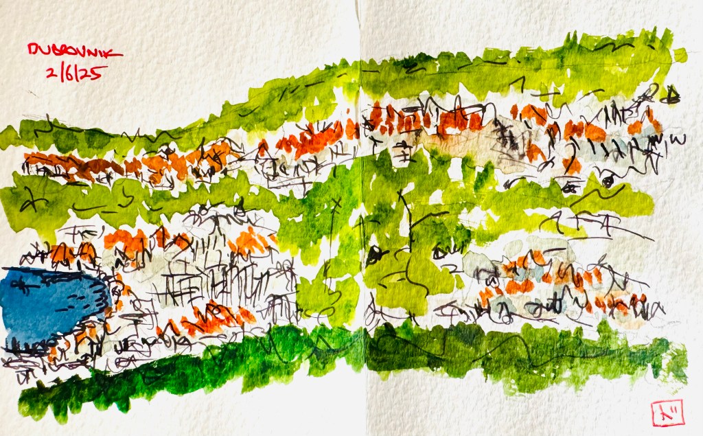 To me orange is the colour of the Dalmatian coast, especially Dubrovnik. The blues of the Adriatic Sea are special and amazing, but as Van Gogh noted, they just need a finishing touch. The accent colour of the orange roof tiles works perfectly, it is powerful, unique and memorable. I bought extra shades of blue paint for my trip to Croatia, but what I really needed were more oranges, but a little shopping solves anything. Sadly, the truth about most things in life must be taken with a grain of salt. During the Homeland war of the early 1990s, a majority of the roofs in Dubrovnik were destroyed by bombardment. After the war France made a massive donation of terracotta tiles to help with the restoration of the city. The generous gift was gratefully accepted, but alas the tiles were orange, the original roof tiles of Dubrovnik had been beige. Orange is still the colour that will remain in my memories and sketchbook. #sostunning #letsmakelemonade