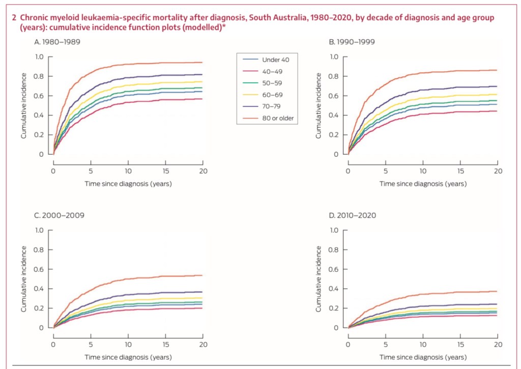 CML is associated with the Philadelphia Chromosome (abnormal chromosome 22), first discovered in 1960. At that time the therapies were arsenic, radiation and hydroxyurea, with sadly minimal effect on survival. After 1980, chemotherapy and bone marrow transplantation made some inroads into CML care, but with considerable side effect costs. The identification of the BCR-ABL fusion gene allowed the development of the targeted TKI therapy, Imatinib. Things improved rapidly. Second and third line TKIs such as Dasatinib and Asciminib followed, increasing response rates and reducing side effects. In 1995 South Australia developed a world class centre for integrated CML therapy and Research, lead by Prof Tim Hughes. They have pioneered the personalised use of TKI therapies, the concept of molecular PCR based treatment monitoring, and championed strategies for the cessation of therapy for selected patients. This recent MJA publication summarises their work and outcomes for SA patients. I am on the green line in chart 4. #luckytobeasouthaustralian #happyproclaimationday #letsmakelemonade