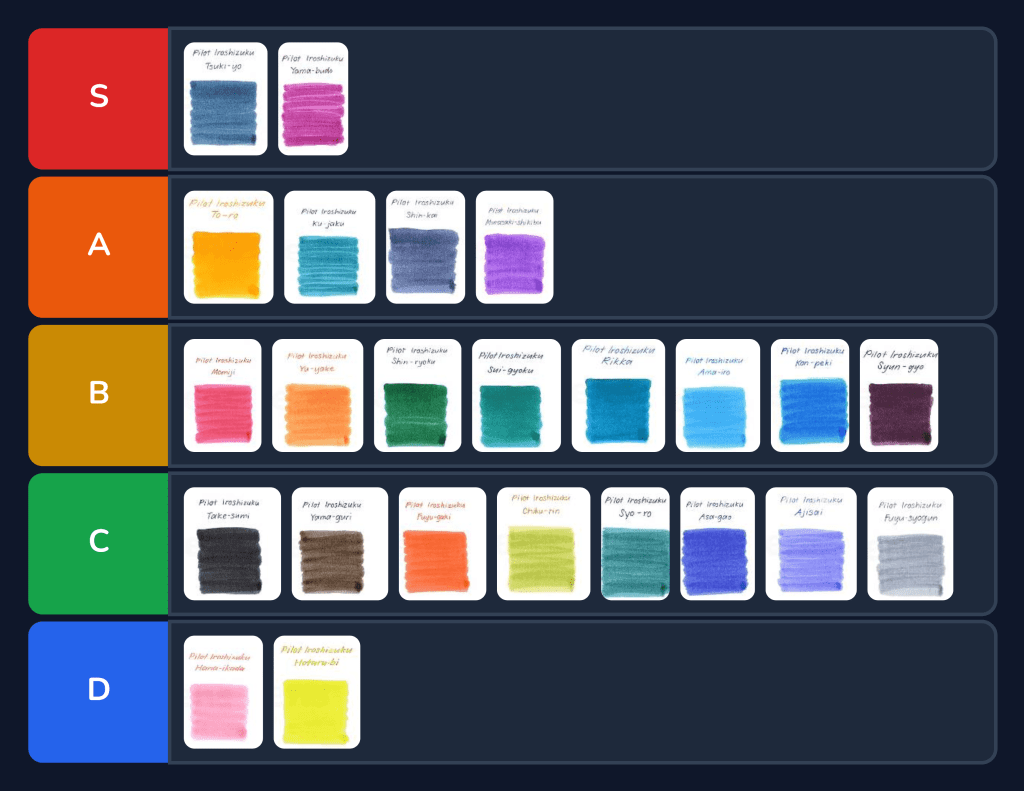 A tier list is a ranking system of best to worst. A tier is generally associated with fixed characteristics. A tier is easily confused with a level system, where components or skills are continually changing, perhaps improving, maybe deteriorating. Tier systems are essentially independent of time, levels are not. The S, A, B, C, D and F tiers are essentially lifted from the Japanese School System. S meaning superior, super, or special. Creating tier lists is certainly having a moment of popularity, particularly for online hobbies. Stationery is a good example. The legendary Brad Dowdy (The Pen Addict), recently posted his tier list of the beloved Japanese Pilot Iroshizuku inks. A hornet’s nest was poked. The fountain pen community is up in arms again. #shinkaiforme #letamakelemonade