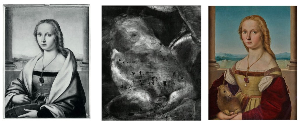 Raphael, Leonardo and Michelangelo have a lot in common. All were master artists, all lived in the same period, all lived in Rome, all shared an intense rivalry, and now all have had blockbuster exhibitions at the Met In New York. Raphael’s exhibition opened this month, over 250 works, one of the centrepieces being Young Woman with Unicorn. Painted in 1506, this piece has had a number of twists and turns. For centuries it was just the portrait of woman. During a 1934 conservation, cleaning of over paint revealed a small unicorn sitting on the woman’s lap. The unicorn was a medieval symbol of chasity in marriage. This painting was to promote the woman as a potential marriage partner. Radiology in 1959 revealed the unicorn was initially painted as a small dog, before the artist upped the symbolism. At some later moment, the presence of a unicorn was obviously thought ridiculous. #medievaltinder #letsmakelemonade